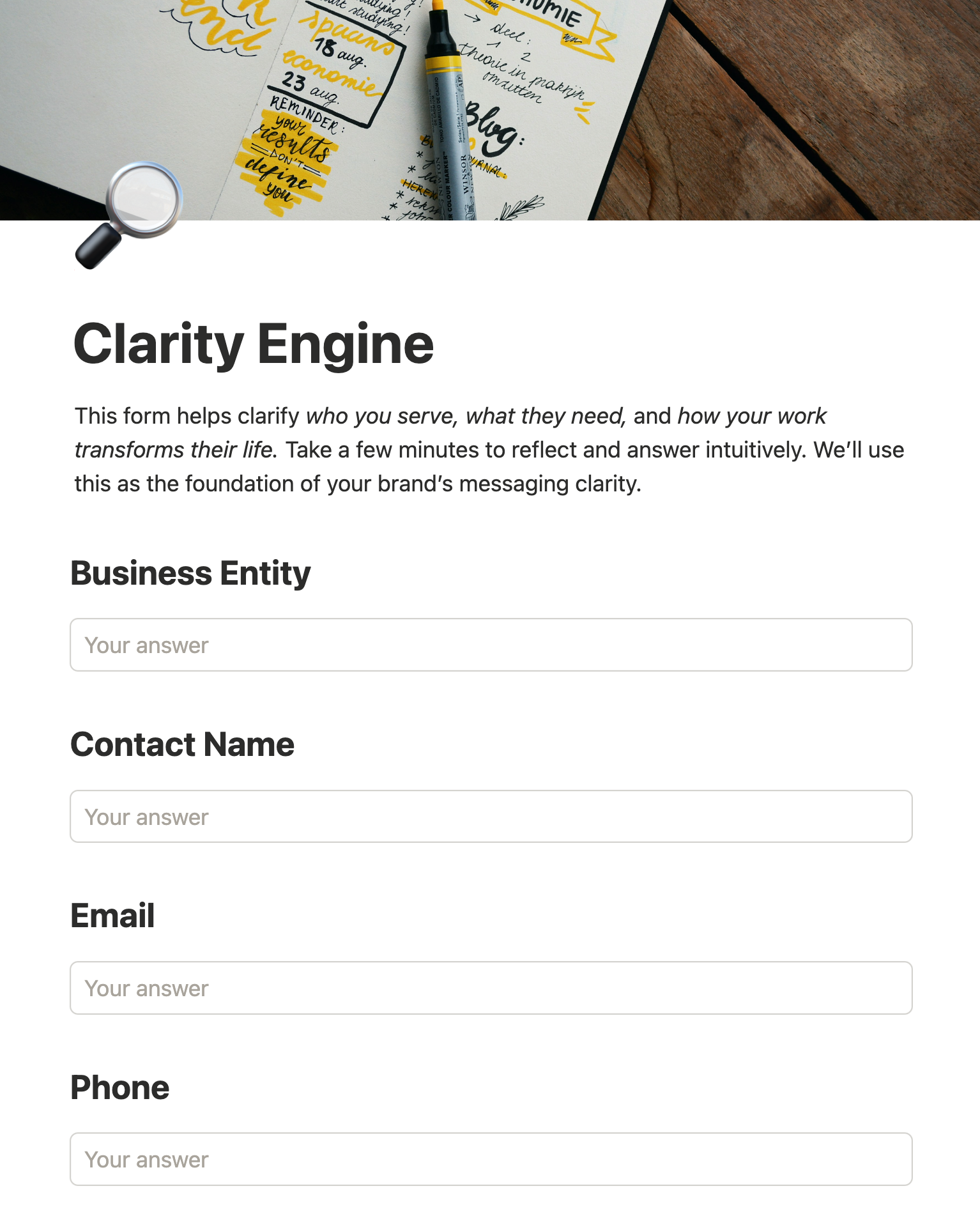 You’ll be directed to a short Clarity Engine form for a few focused questions about your brand and message.